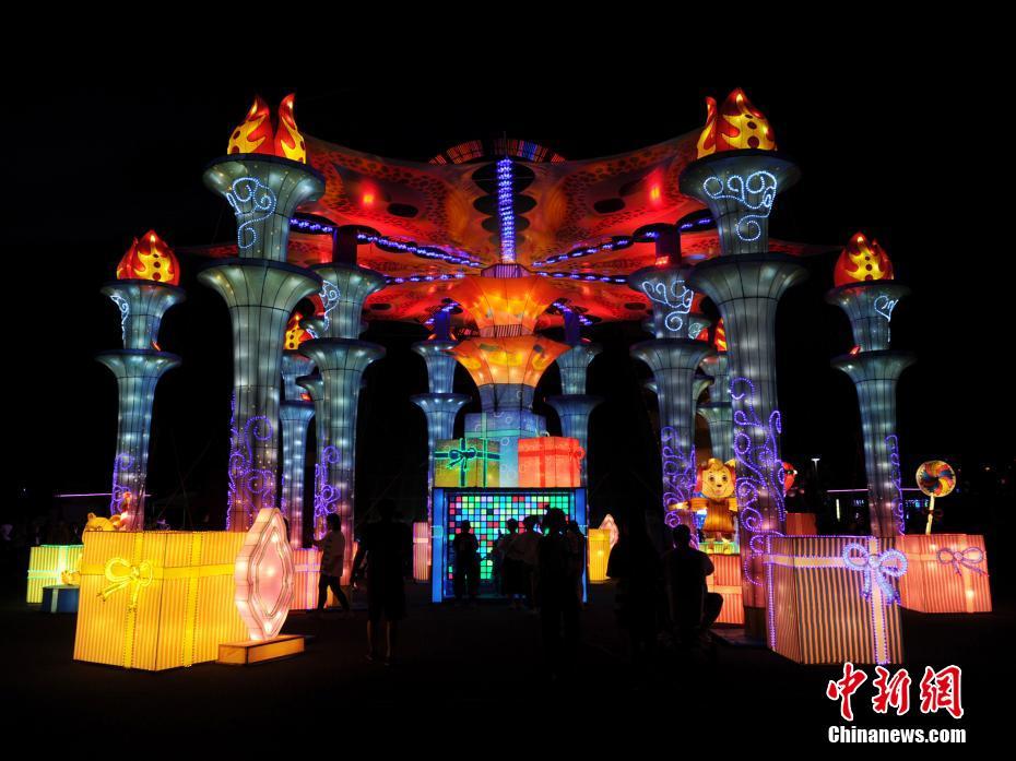 6月19日晚,在位于吉林长春的长影世纪城内,近百组大型彩灯一齐点亮。这些大型彩灯均采用现代高科技声光电感应技术,融入仿声效果、烟雾特效、舞台追光等舞美设计。中新社记者 刘栋 摄