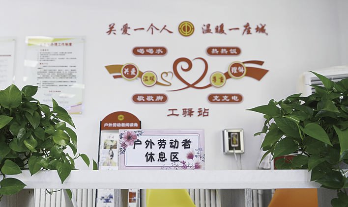 “工驿站”功能完善,可以为户外劳动者提供饮水、微波炉、多功能电源插座等,已成为户外劳动者休息的温馨港湾。 (本组摄影/孙建一)
