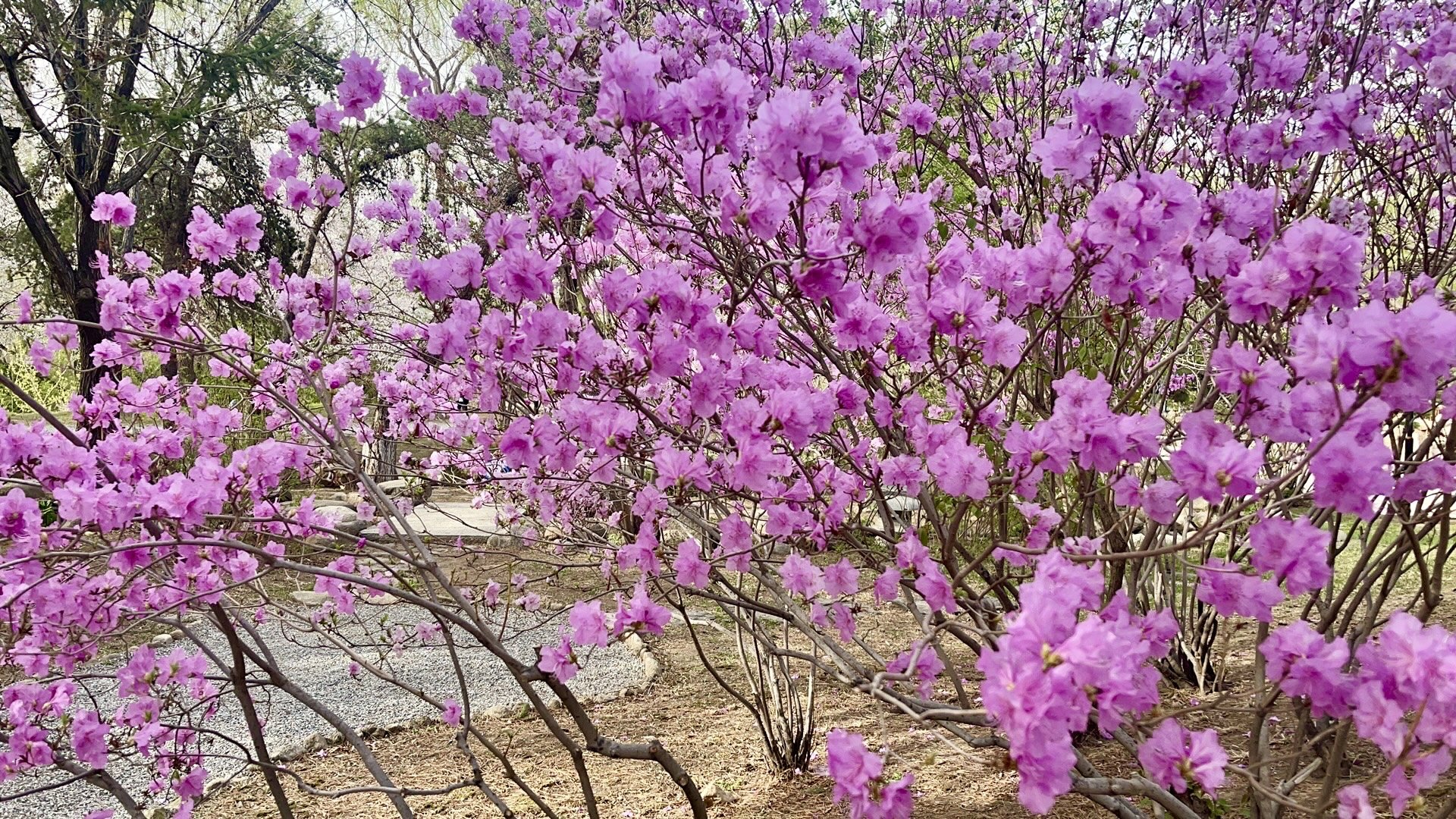 徜徉在美好的春天里,走累了就停下脚步,欣赏春景。发出嫩芽的绿植加以连翘、京桃、杜鹃的点缀,相映成趣,一幅幅绚烂缤纷的画面映入眼帘。