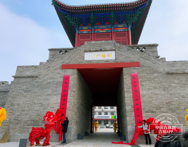 1月22日上午,在通化老城·龙兴里主城门和萃文门,巨幅春联悬挂城门,迎新年氛围感“满格”。