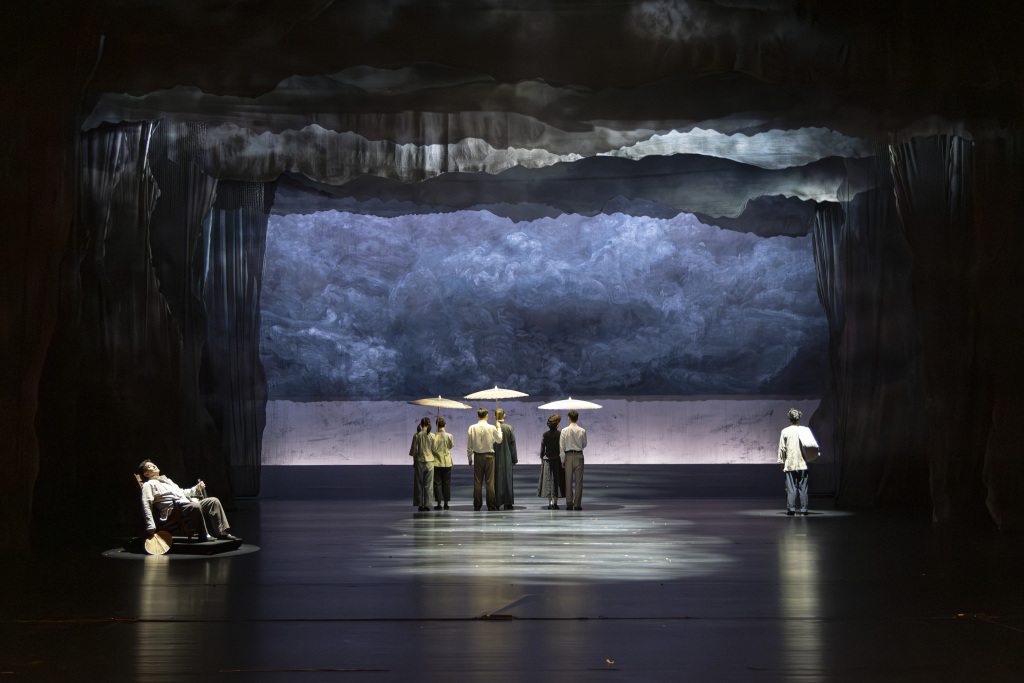 重重帷幔构成满台遮天蔽日的阴云,预示着雷雨将至,衬托出了周公馆压抑的氛围;一张上世纪二三十年代无锡当地的古董沙发摆放在舞台正中,成为一个重要的意象,见证了周公馆内数十年来两代人的爱恨情仇;三把油纸伞首尾呼应,三位年轻人撑伞与三位老人走向远方……本版《雷雨》在舞台空间上进行了诸多实验性的拓展,让全剧呈现兼具象征与写实的双重表达,充满了“诗”的气质。