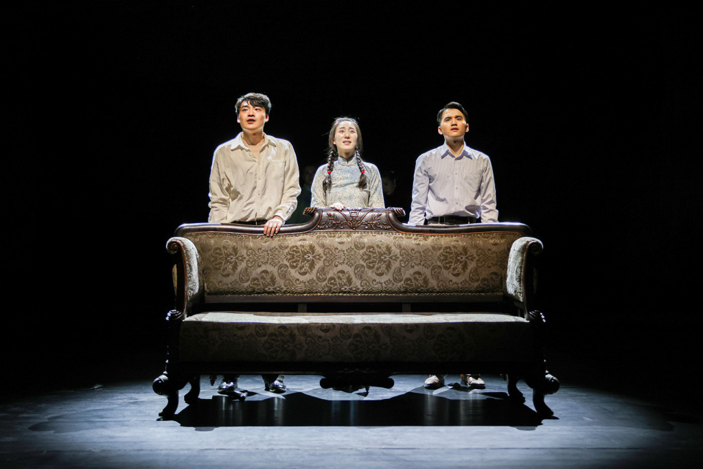 王俊淇(左)饰演周萍、陈红旭(中)饰演四凤、李京旭(右)饰演周冲。摄影:李春光