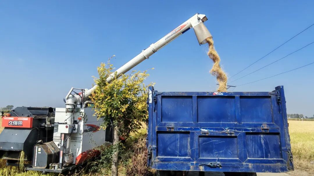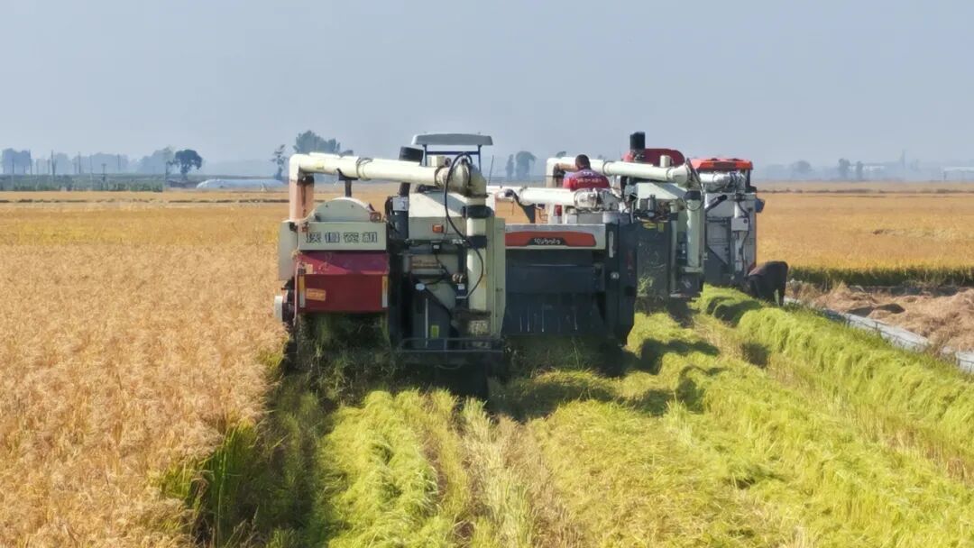 田埂上,几台水稻收割机正匀速作业,割台划过稻田,稻穗被整齐收割,留下的稻茬高度均匀——这是对土地的尊重,也是对后续种植的考量。收割下来的稻谷将直接运往稻米加工厂,省去中间环节,确保“从田间到车间”的新鲜。