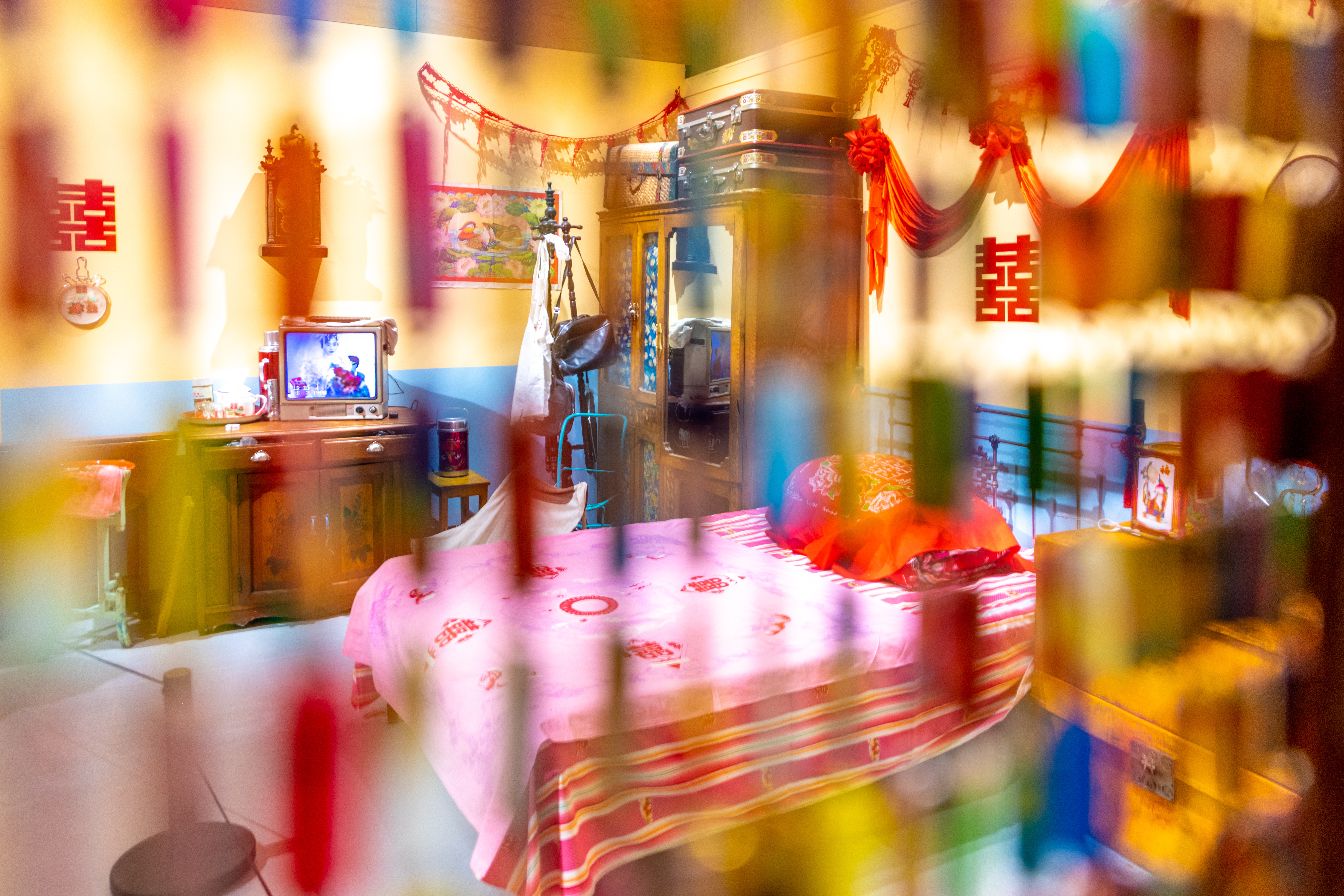 铁艺床上铺着印着“囍”字的床单,旁边立着刷着黄漆的老式衣柜,上面摆着的收音机隐约飘出老歌曲调,连茶几上的搪瓷盘都还原了当年的模样。
