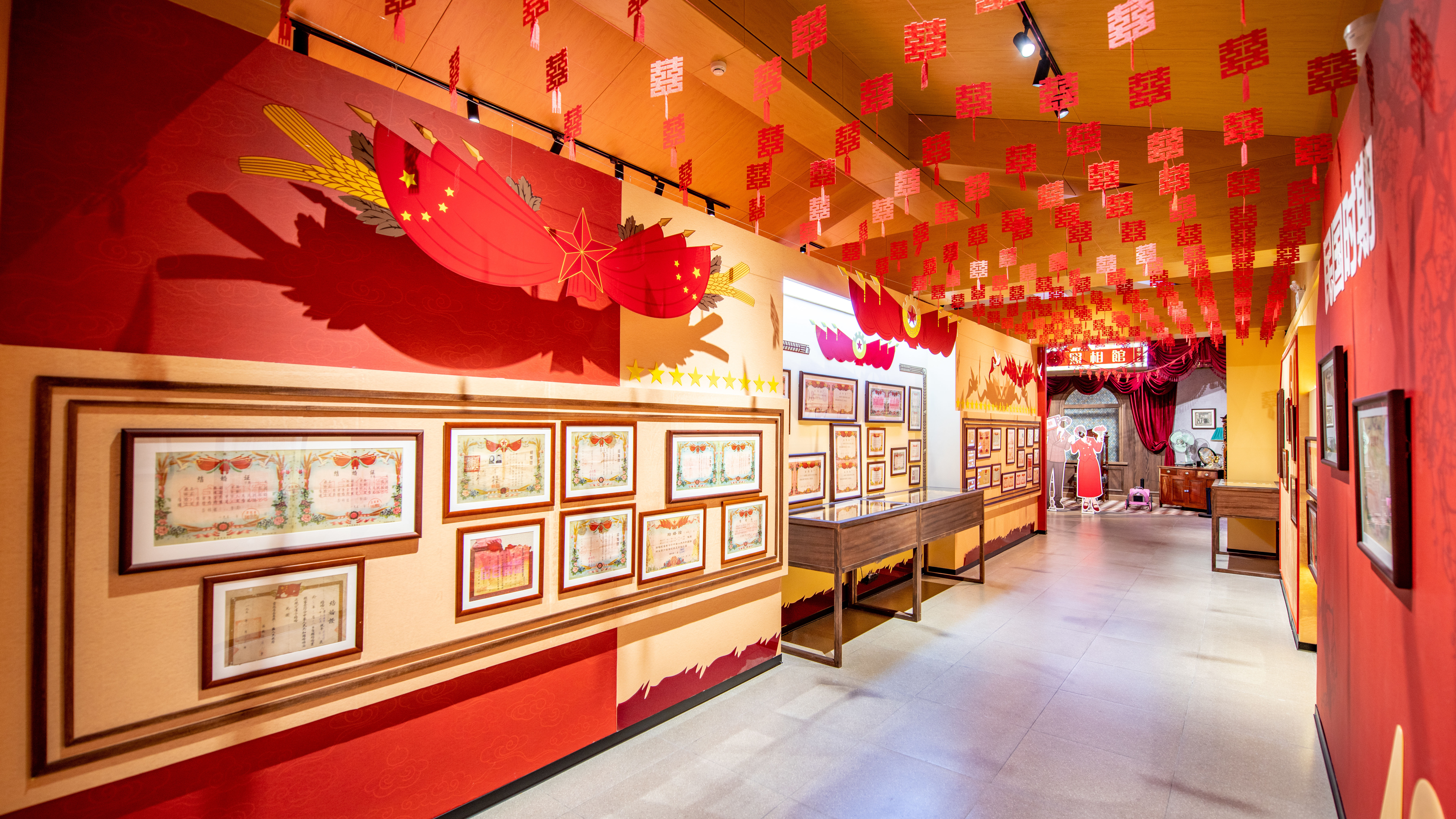 300多件展品大多出自民间藏家,每一件都带着时光的包浆与生活的痕迹。翻开民国时期的婚俗礼帖,朱红底色上绘着孔雀开屏、喜鹊登梅,充满时代印记,笔墨工整的书法细细记录着纳采、问名、纳吉、纳征、请期、亲迎的传统六礼,满是中式婚礼独有的仪式感。