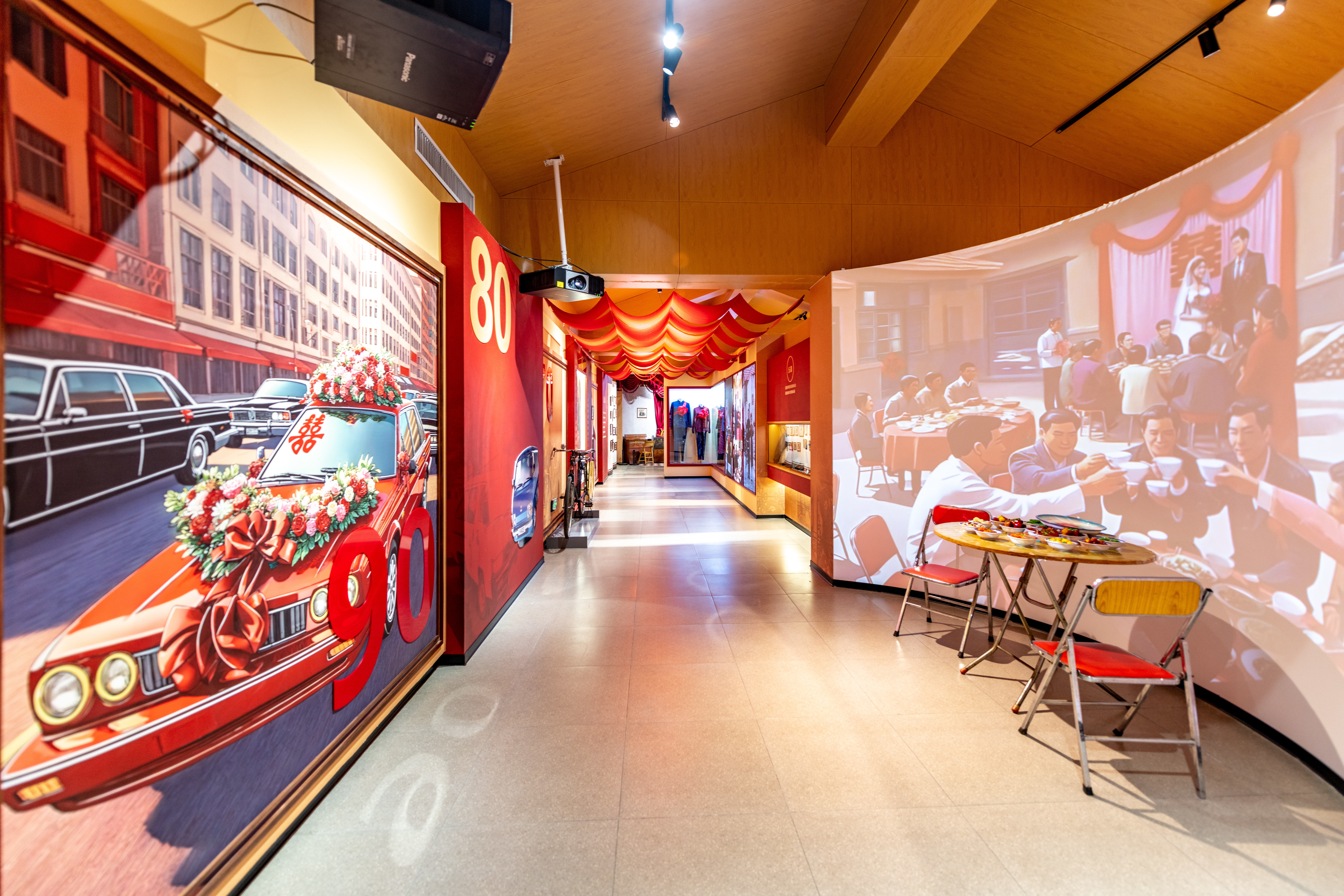 AI动态婚宴区,配以实景搭建的喜宴桌椅,屏幕上的动态画面里,宾客举杯道贺、孩童追逐嬉戏,坐在这里仿佛真的置身旧时喜宴,能感受到那种邻里乡亲齐聚的热闹与温情。