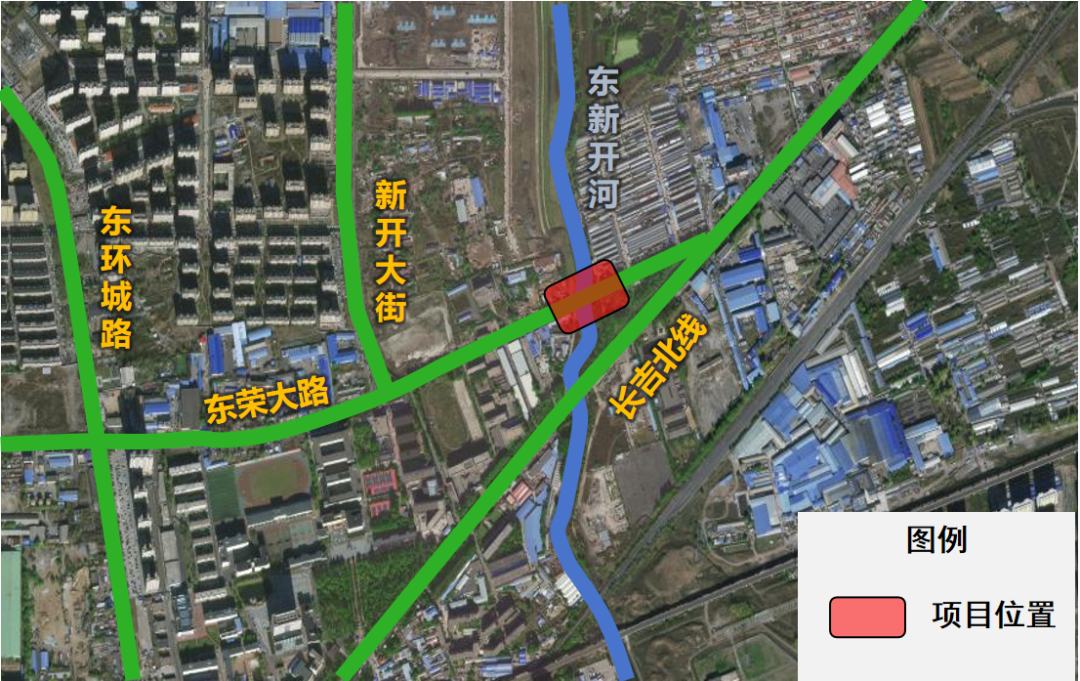 长春市东荣大路跨东新开河桥位于东环城路以东、长吉北线以北的东荣大路与东新开河交会处。桥梁全长57米,宽28米,双向四车道。桥梁翻建工程于2025年7月2日开工,11月4日完成全部桥梁主体及附属工程,于11月6日正式开放交通。