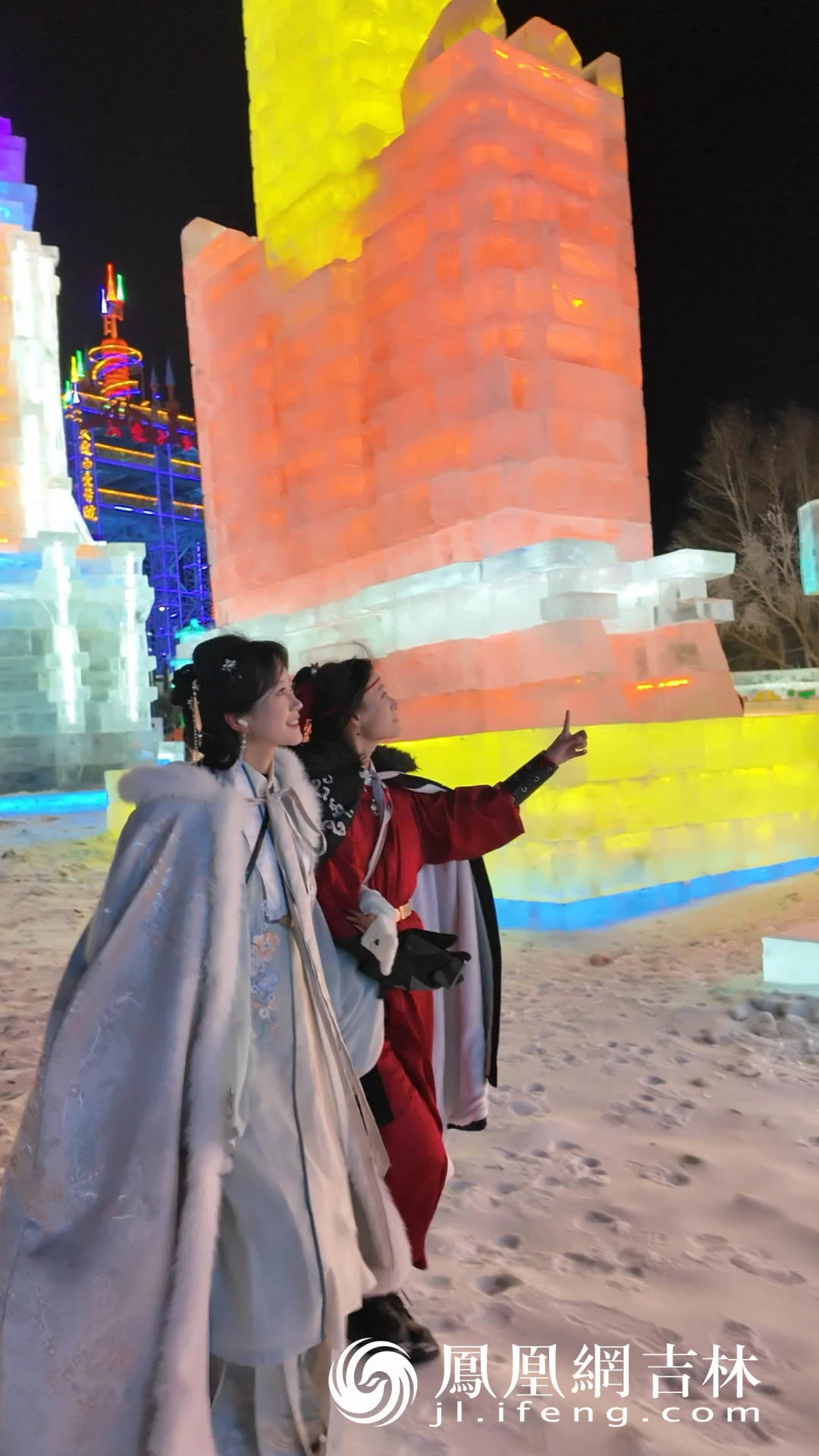 她和同学彭丽、古阳甚至精心准备了古风装扮,在梦幻的冰雕玉砌间拍摄创意视频,将青春的古韵与冰雪的现代奇幻完美融合。