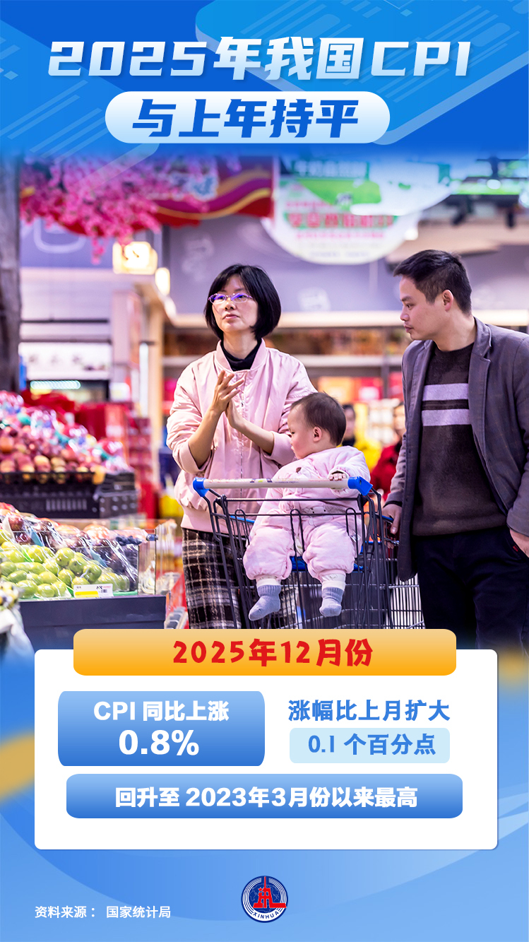 新华社北京1月9日电(记者王雨萧)国家统计局1月9日发布数据显示,2025年12月份,全国居民消费价格指数(CPI)环比上涨0.2%,同比上涨0.8%;2025年全年,CPI与上年持平。