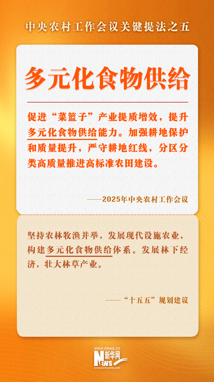 构建多元化食物供给体系。把确保国家粮食安全作为发展农业大产业的首要任务,不断巩固提升粮食综合生产能力,全方位夯实粮食安全根基。同时,践行大农业观、大食物观,全方位、多途径开发食物资源,从耕地资源向整个国土资源拓展、从传统农作物和畜禽资源向更丰富的生物资源拓展,广辟食物来源。大力发展木本粮油生产和林下经济,不断提高森林食品供给能力。推进水域生态保护和渔业资源高效利用相协调,积极扶持发展深远海渔业。大力发展现代设施种植业、设施畜牧业、设施渔业,建设现代加工物流等设施,升级技术装备,提高产出多样性和生产效率。(据《党的二十届四中全会〈建议〉学习辅导百问》)