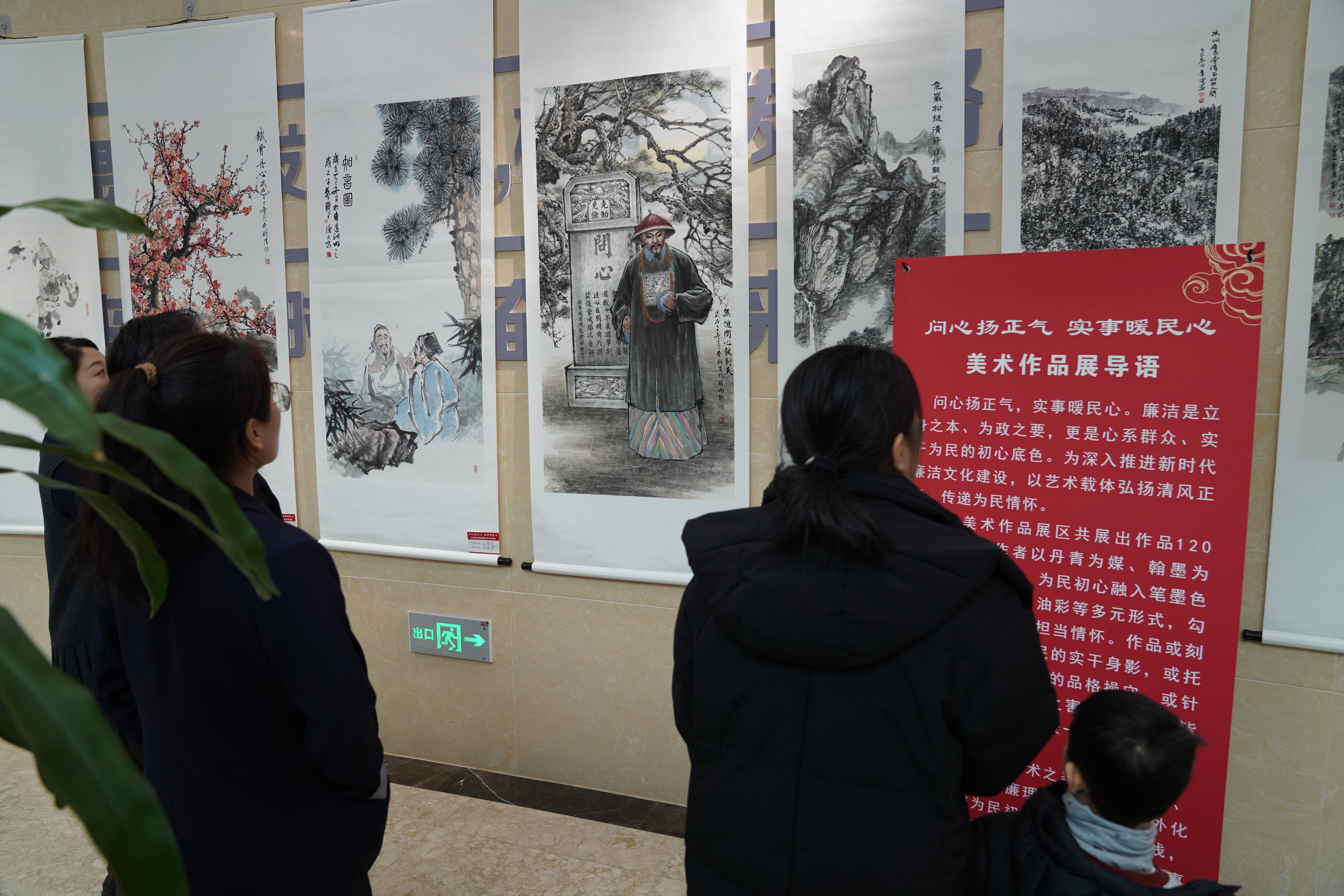 展览设有书法、美术、剪纸及民生实事纪实摄影等多个主题展区。书法作品以笔墨言志,通过行、草、篆、隶等多元书体诠释清正廉洁的时代内涵;美术作品以丹青为媒,勾勒清正风骨与为民情怀;剪纸作品以纸传情,将廉政文化巧妙融入非遗技艺;摄影作品真实记录了该市聚焦群众急难愁盼、用心用情解民忧纾民困的实践成果,生动展现了“民生清单”转化为群众“幸福账单”的温暖历程。