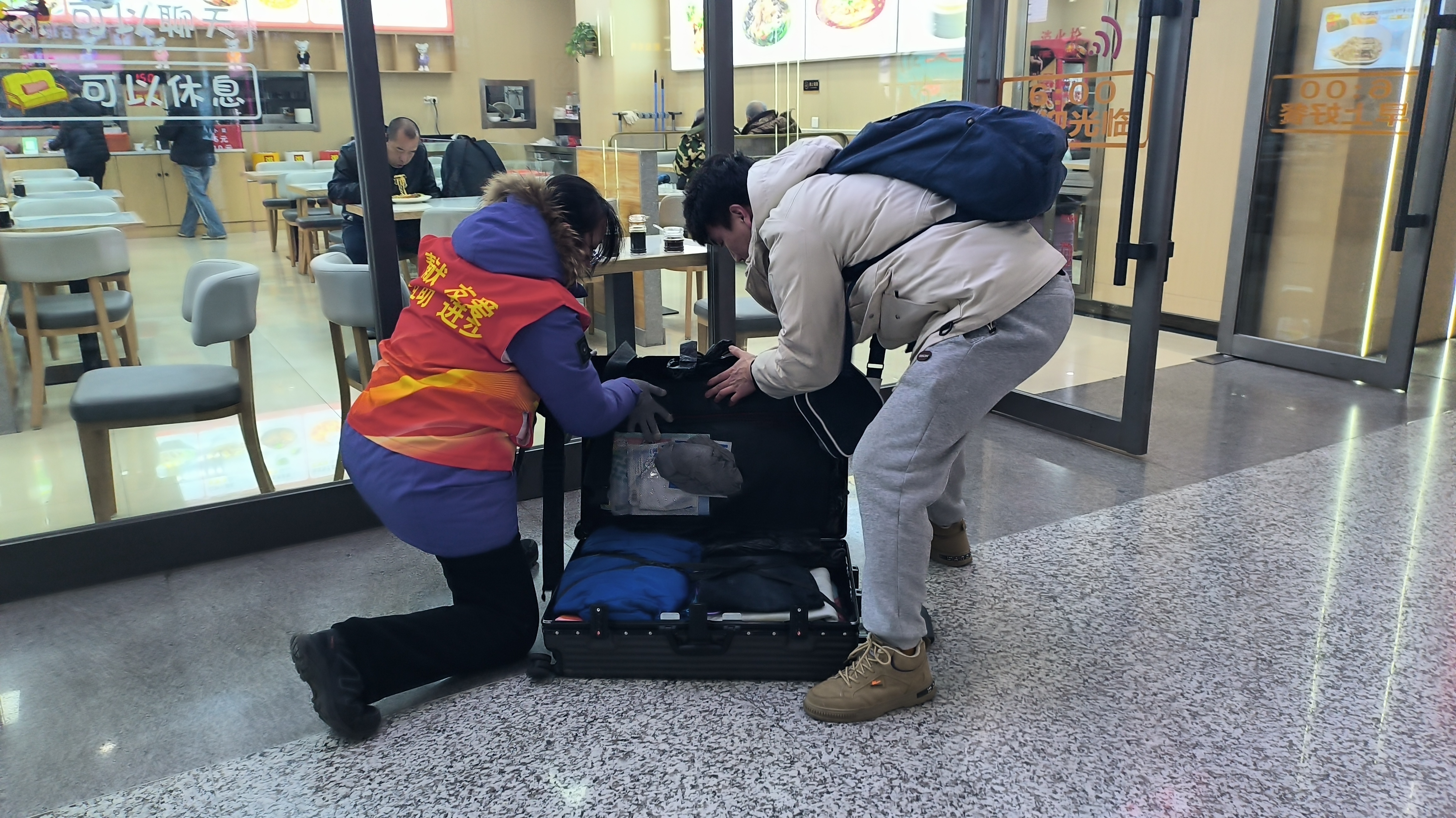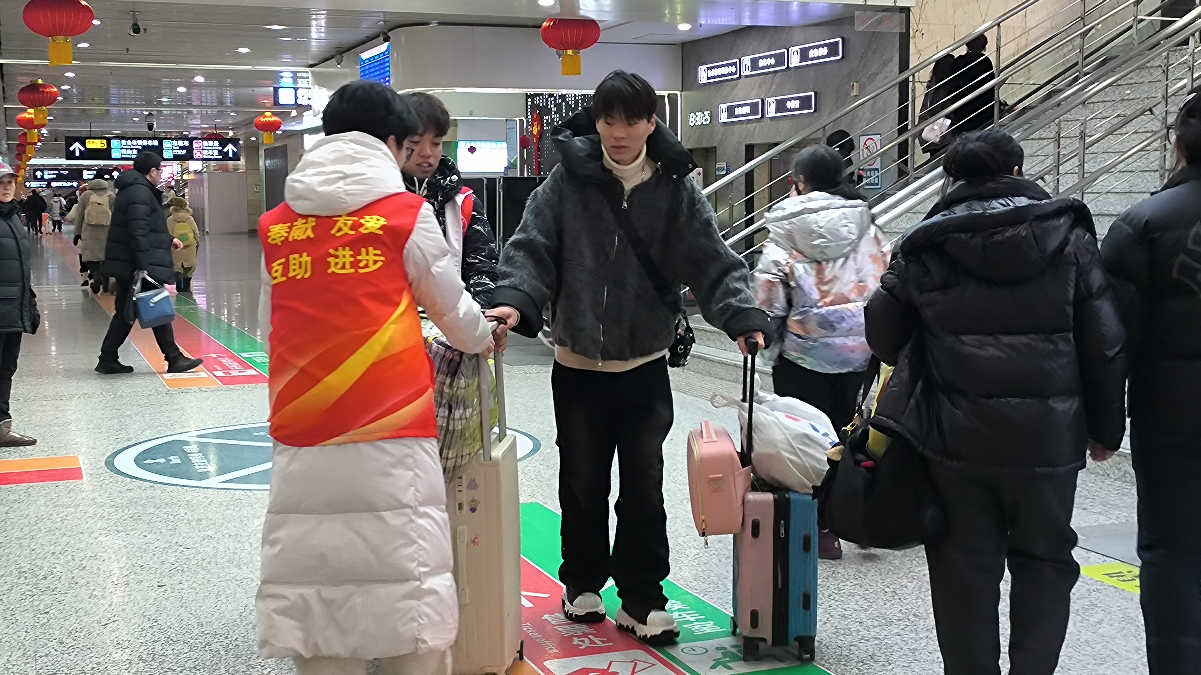 “您往这边走,换乘通道就在负一层东侧,我帮您拎这个大箱子!”长春站北出站口的雪风里,延边大学闫辰的声音裹着热气钻进人群——他红马甲的领口沾了层薄雪,手却稳稳托着旅客的行李箱,脚步快得带起一阵风。2月5日,春运高峰,记者蹲守现场,看见返乡学子们把“暖”字写满车站的日常。